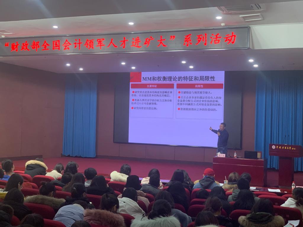 本网讯 2019年12月28日下午,球王会MPAcc教育中心主办的“精彩管理”学术大讲堂——“财政部全国会计领军人才进矿大”系列活动正式启幕,在交流中心二层报告厅举行了首场讲座,讲座嘉宾陈广垒博士现任西藏宁算科技集团有限公司副总裁兼财务总监、中国绿色制造联盟副秘书长,讲座题目是《股东财富最大化下的融资和资本运营》,此次活动由球王会副经理赵学彬主持,晁坤、信春华、徐玮云、郝素利、王阳等多位老师和广大研究生共同听取了此次讲座。