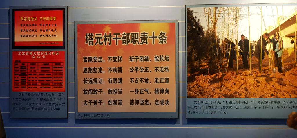 塔元庄村位于正定城西,坐落于滹沱河北岸,全村480户,2030人,党员101人。2013年7月,习近平总书记来塔元庄村考察时深情勉励道:“做好基层基础工作十分重要,只要每个基层党组织和每个共产党员都有强烈的宗旨意识和责任意识,都能发挥战斗堡垒作用、先锋模范作用,我们党就会很有力量,我们国家就会很有力量,我们人民就会很有力量,党的执政基础就能坚如磐石。”塔元庄村牢记习近平总书记的殷殷嘱托,党员干部认真落实“要搞好领导班子的自身建设”的要求,实施“承诺清单”,廉洁务实、甘于奉献,立足不同的发展阶段,建强战斗堡垒,践行共富理念,探索多元路径,沿着习总书记确定的“半城郊型”经济的路子,蹚出了一条村企共建共享、具有城郊村特色的乡村振兴之路,成为新时代乡村振兴一个响当当的村庄品牌。2016年,塔元庄村党支部荣获“全国先进基层党组织”称号。2021年,支书记尹计平被评为“全国优秀共产党员”。